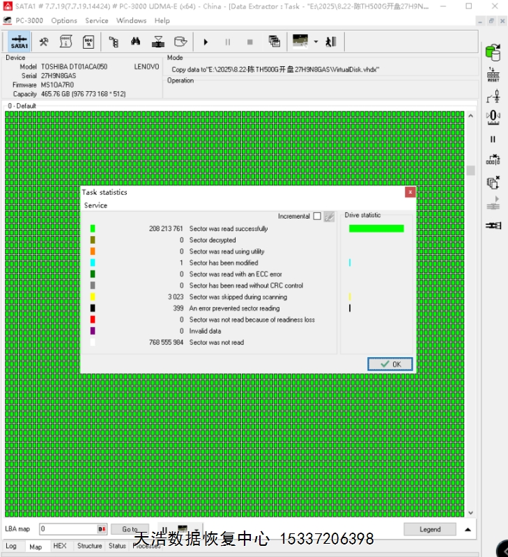 解决方案:收到硬盘后,在无尘环境更换兼容的磁头,再接到专业数据恢复工具ACE PC-3000 UDMA Express上,通电硬盘正常认盘,备份好固件,DE镜像,最后客户硬盘内的重要数据大部分成功恢复,里面的多个数据库均完美恢复!