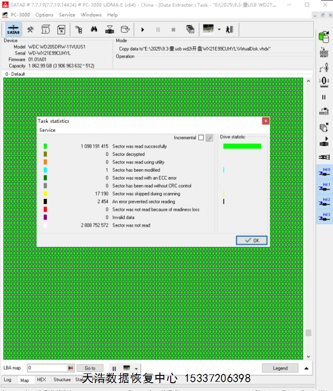 解决方案:收到硬盘后,在无尘环境更换兼容的磁头,原ROM解锁,原始usb板飞线改SATA,接到专业数据恢复工具ACE PC-3000 UDMA Express上,通电硬盘认盘,备份好关键固件,做好前期处理工作后,DE分头镜像,最后客户硬盘内的重要数据大部分成功恢复!