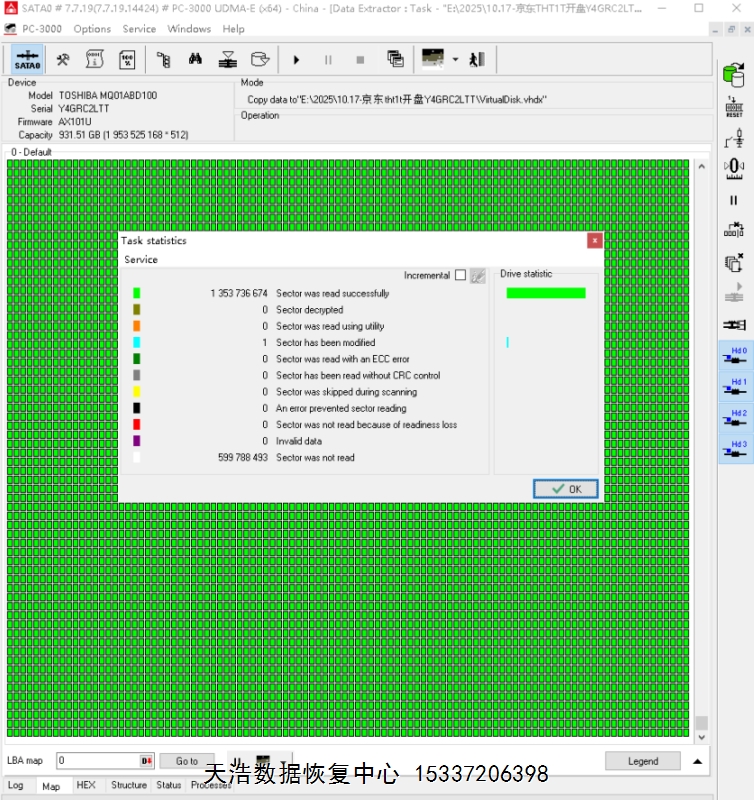 解决方案:收到硬盘后,在无尘环境拆开,更换兼容的磁头,接到数据恢复工具ACE PC3000 UDMA EXPRESS上,通电正常认盘,DE分头镜像,最后客户硬盘内的重要数据基本完美恢复。
