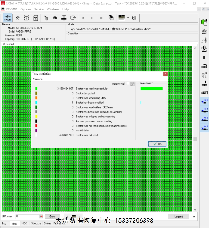解决方案:收到硬盘后,在无尘环境拆开,清洗盘片后,更换兼容的磁头,接到数据恢复工具ACE PC-3000 UDMA Express上,通电硬盘正常认盘,做好数据恢复前的固件备份、处理工作后,DE分头镜像,最后客户硬盘内重要数据基本完整恢复!