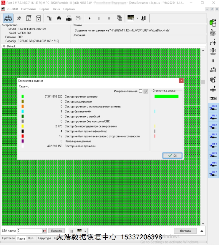 解决方案:收到硬盘后,在无尘环境拆开硬盘,更换兼容的碰头,接到数据恢复工具ACE PC-3000 Portable III上,硬盘正常认盘,数据区前后都能正常访问,备份好固件,做好镜像前的处理工作,DE分头镜像,成功恢复客户硬盘内几乎全部重要数据!
