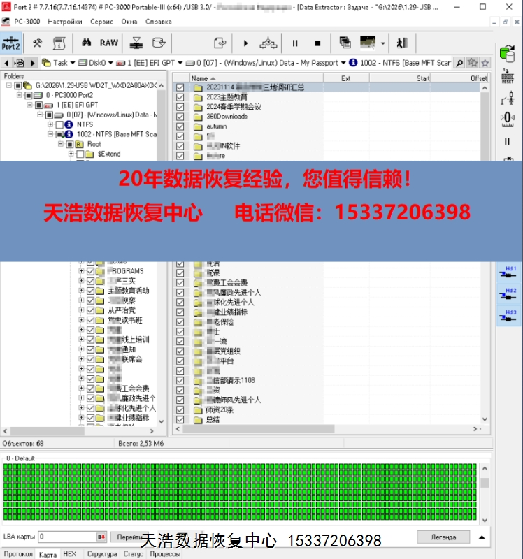解决方案:收到硬盘后,在无尘环境更换兼容的磁头,原ROM解锁,原始usb板飞线改SATA,再接到专业数据恢复工具ACE PC-3000 Portable 3上,通电硬盘认盘,备份好关键固件,做好前期处理工作后,DE分头镜像,最后客户硬盘内的重要数据基本完整恢复!