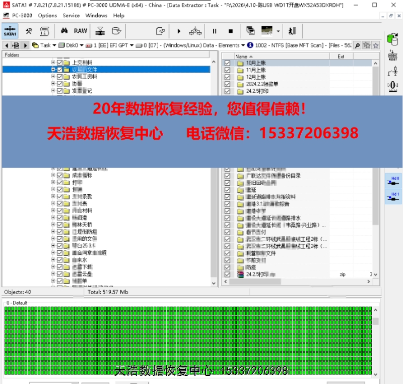 解决方案:收到硬盘后,原ROM解锁,原始usb板飞线改SATA,接到专业数据恢复工具ACE PC-3000 UDMA Express上,检测发现是0头不良,在无尘环境更换兼容的磁头,再通电硬盘认盘,备份好关键固件,做好前期处理工作后,DE分头镜像,最后客户硬盘内的重要数据基本完整恢复!