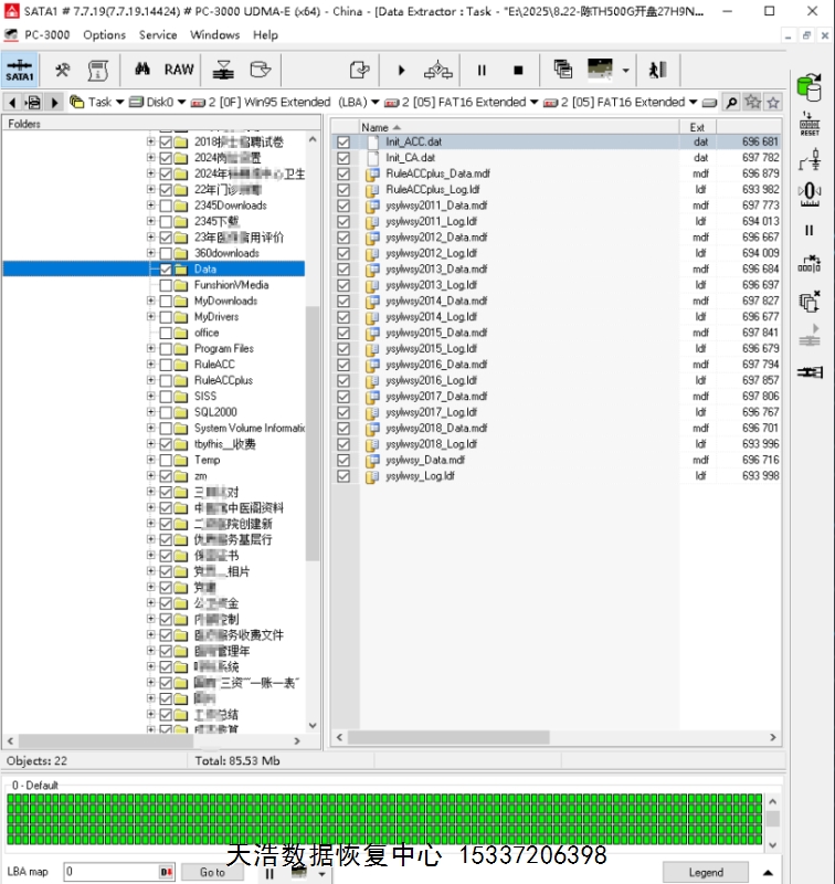 解决方案:收到硬盘后,在无尘环境更换兼容的磁头,再接到专业数据恢复工具ACE PC-3000 UDMA Express上,通电硬盘正常认盘,备份好固件,DE镜像,最后客户硬盘内的重要数据大部分成功恢复,里面的多个数据库均完美恢复!