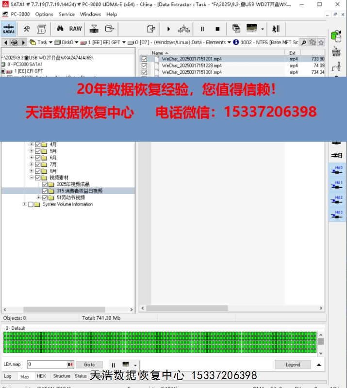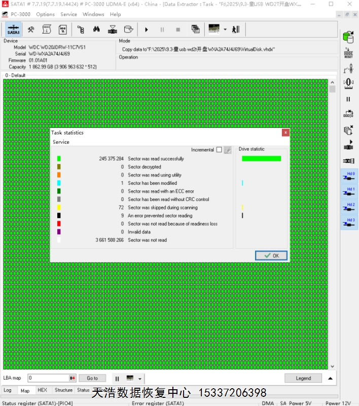 解决方案:收到硬盘后,在无尘环境更换兼容的磁头,原ROM解锁,原始usb板飞线改SATA,接到专业数据恢复工具ACE PC-3000 UDMA Express上,通电硬盘认盘,备份好关键固件,做好前期处理工作后,DE分头镜像,最后客户硬盘内的重要数据基本完整恢复!