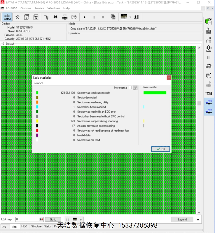解决方案:收到硬盘后,在无尘环境拆开硬盘,更换兼容的磁头,接到数据恢复工具ACE PC-3000 UDMA Express上,通电硬盘声音正常但不认盘,通过希捷虚拟启动技术处理后,硬盘正常认盘,DE分头镜像,最后客户硬盘内的重要数据基本完美恢复!