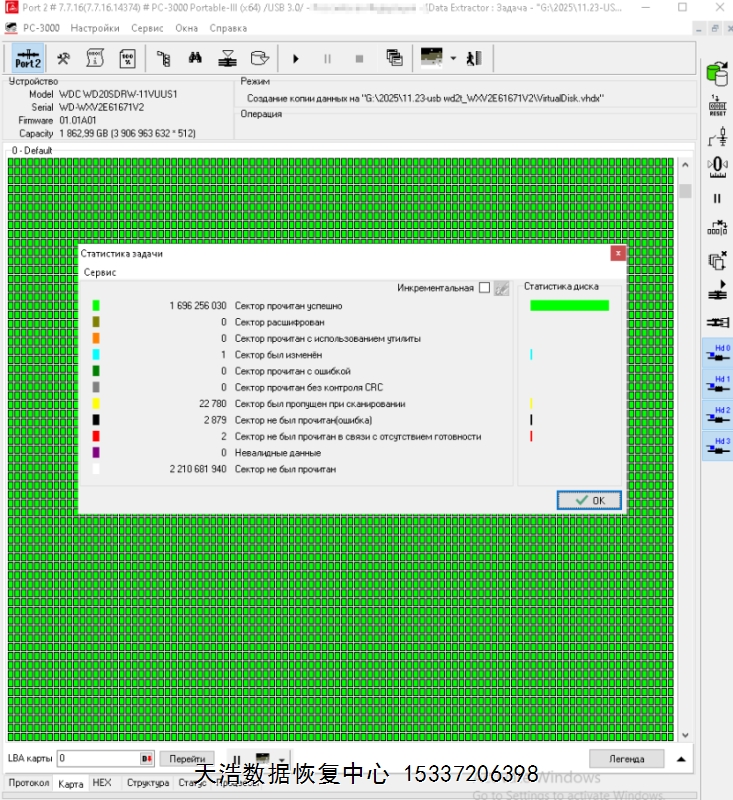 解决方案:收到硬盘后,在无尘环境更换兼容的磁头,原ROM解锁,原始usb板飞线改SATA,接到专业数据恢复工具ACE PC-3000 Portable 3上,通电硬盘认盘,备份好关键固件,做好前期处理工作后,DE分头镜像,最后客户硬盘内的重要数据大部分成功恢复!