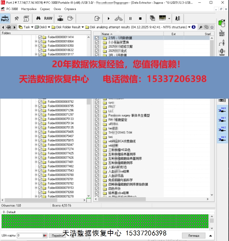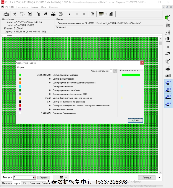 解决方案:收到硬盘后,在无尘环境更换兼容的磁头,原ROM解锁,原始usb板飞线改SATA,接到专业数据恢复工具ACE PC-3000 Portable 3上,通电硬盘认盘,备份好关键固件,做好前期处理工作后,DE分头镜像,最后客户硬盘内的重要数据绝大部分都成功恢复!