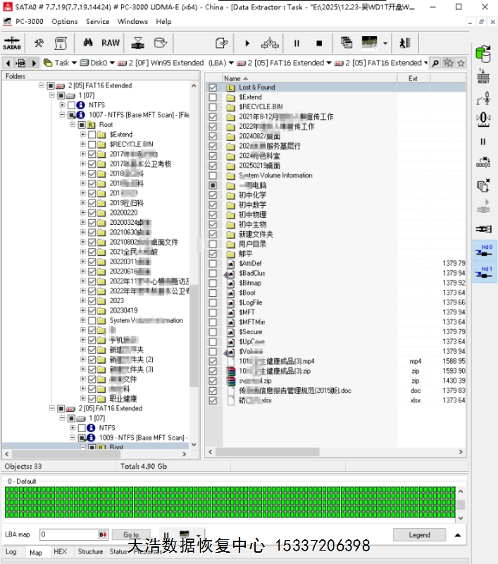 解决方案:收到硬盘后,在无尘环境更换兼容的磁头后,接到专业数据恢复工具ACE PC-3000 UDMA Express上,通电硬盘认盘,备份好关键固件,做好恢复的前处理工作后,DE分头镜像,最后客户硬盘内的重要数据基本完整恢复!