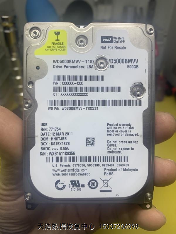 硬盘型号:WD5000BMVV-11SXZS1 SN:WXB1A11K8356 FW:23001U 电路板号:771801-000