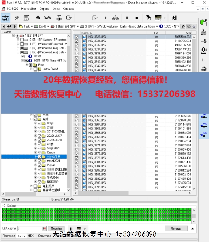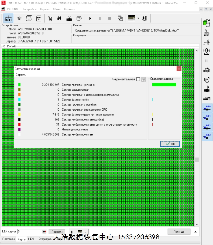 解决方案:收到硬盘后,在无尘环境更换兼容的磁头,接到专业数据恢复工具ACE PC-3000 Portable III上,原板解锁,通电硬盘认盘,DE分头镜像,发现所有面的数据都能正常镜像,最后成功恢复客户硬盘内几乎全部重要数据!