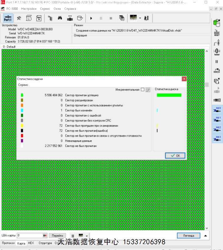 解决方案:收到硬盘后,在无尘环境更换兼容的磁头,接到专业数据恢复工具ACE PC-3000 Portable III上,原板解锁,通电硬盘认盘,DE分头镜像,发现所有面的数据都能正常镜像,最后成功恢复客户硬盘内几乎全部重要数据!