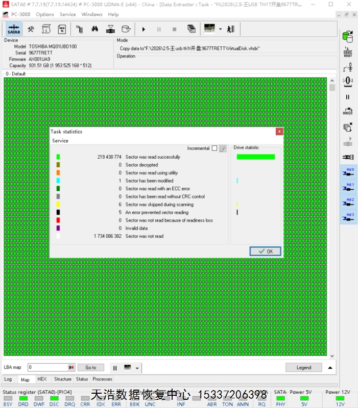 东芝1t原装移动硬盘开盘恢复数据成功案例