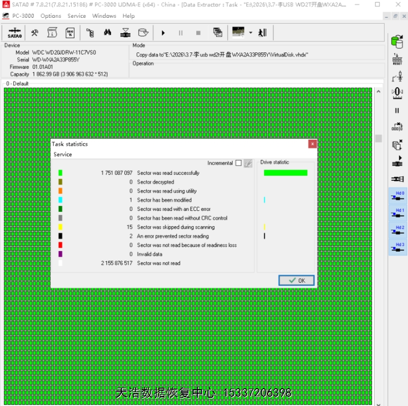 解决方案:收到硬盘后,在无尘环境更换兼容的磁头,原ROM解锁,原usb板飞线改SATA,接到专业数据恢复工具ACE PC-3000 UDMA Express上,通电硬盘认盘,备份好关键固件,做好前期处理工作后,DE分头镜像,最后客户硬盘内的重要数据基本完整恢复!