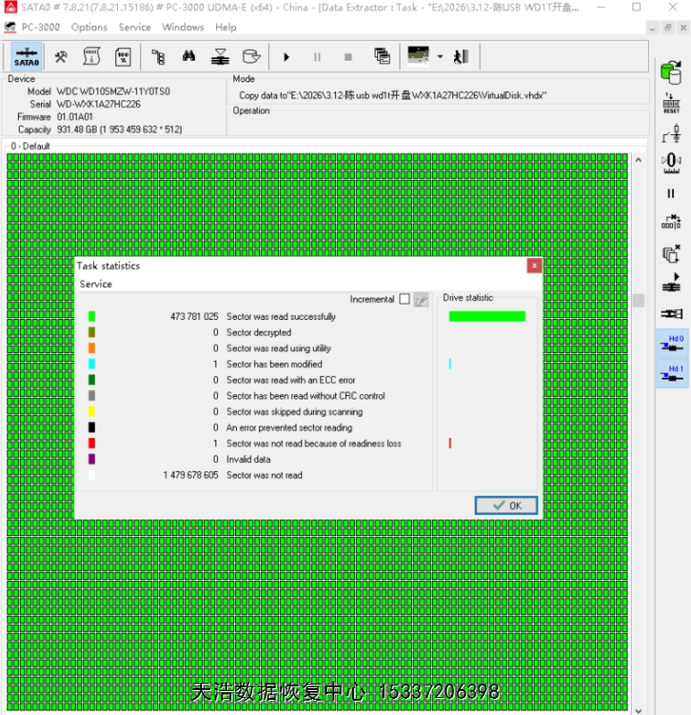 解决方案:收到硬盘后,在无尘环境更换兼容的磁头,原ROM解锁,更换兼容的SATA电路板,接到专业数据恢复工具ACE PC-3000 UDMA Express上,通电硬盘认盘,备份好关键固件,做好前期处理工作后,DE分头镜像,最后客户硬盘内的重要数据基本完整恢复!