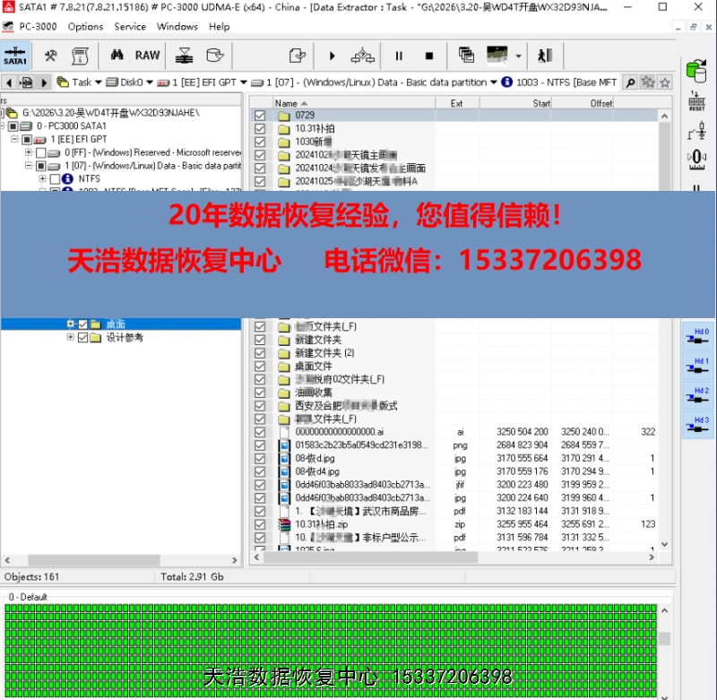 解决方案:收到硬盘后,在无尘环境更换兼容的磁头,接到专业数据恢复工具ACE PC-3000 UDMA Express上,原板解锁,通电硬盘认盘,DE分头镜像,最后客户硬盘内重要数据基本完美恢复!