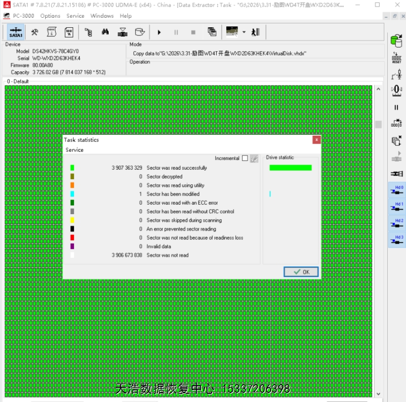 解决方案:收到硬盘后,在无尘环境更换兼容的磁头,接到专业数据恢复工具ACE PC-3000 UDMA Express上,原始ROM解锁,通电硬盘认盘,DE分头镜像,最后客户硬盘内重要数据基本完美恢复!